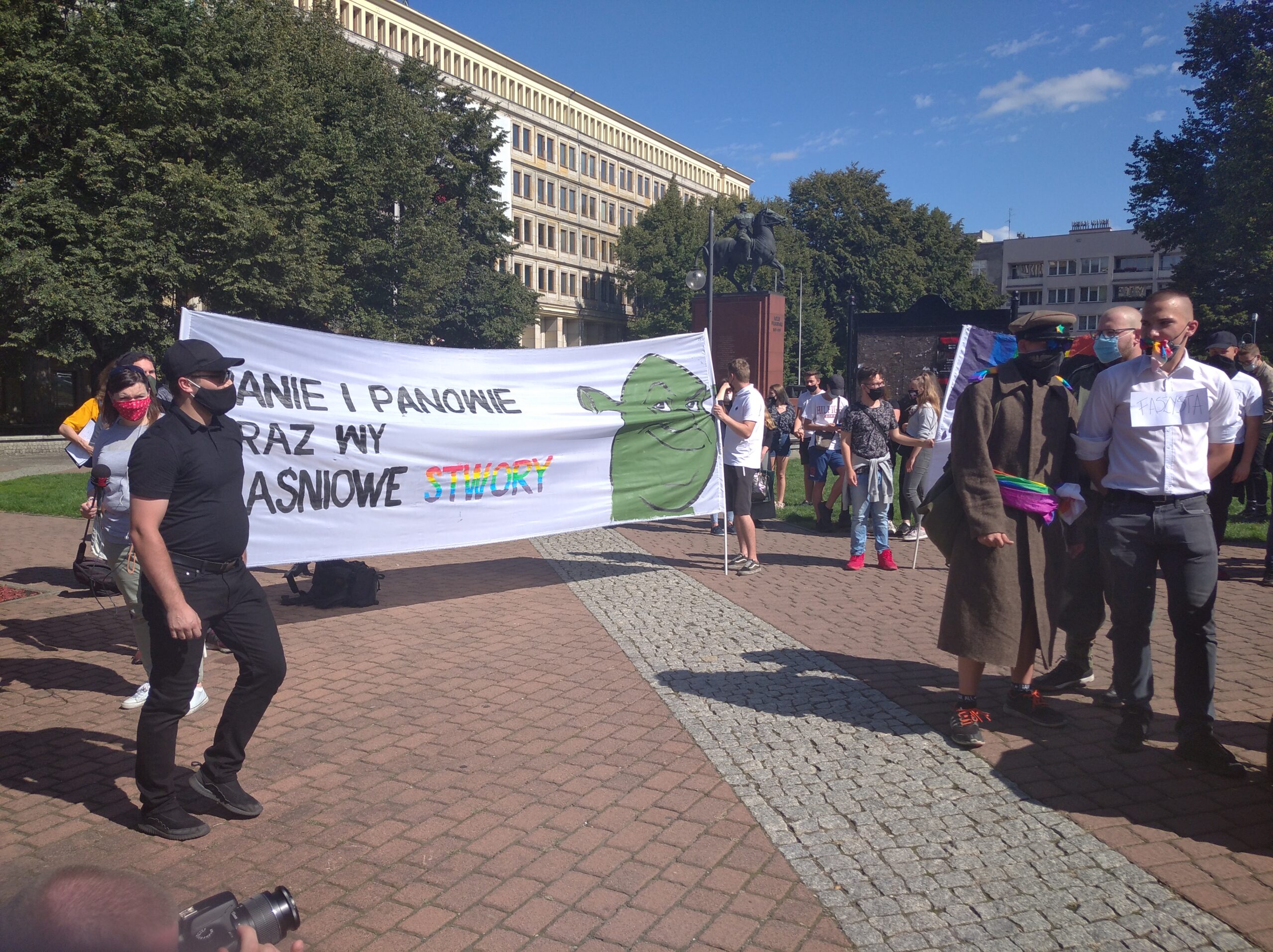 Na początku miało miejsce popkulturowe nawiązanie do motywu znanego z filmu Shrek. Zaprezentowano transparent z odręcznie wykonanym wizerunkiem znanego wszystkim ogra i napisem „Panowie, Panie oraz wy, baśniowe stwory”. Wykonawcy transparentu podkreślają, że tak jak Shrekowi, tak i mieszkańcom Katowic, wizyta „nietypowych istot” była nie na rękę. Jak mówią, „cyrk obwoźny” i ludzie z nim związani, nie mają nic wspólnego z miastem i są w Katowicach nieproszonymi gośćmi. Być może ideologii LGBT, która każe wierzyć w istnienie nieskończonej ilości płci, rzeczywiście bliżej jest do świata baśniowego niż realnego.