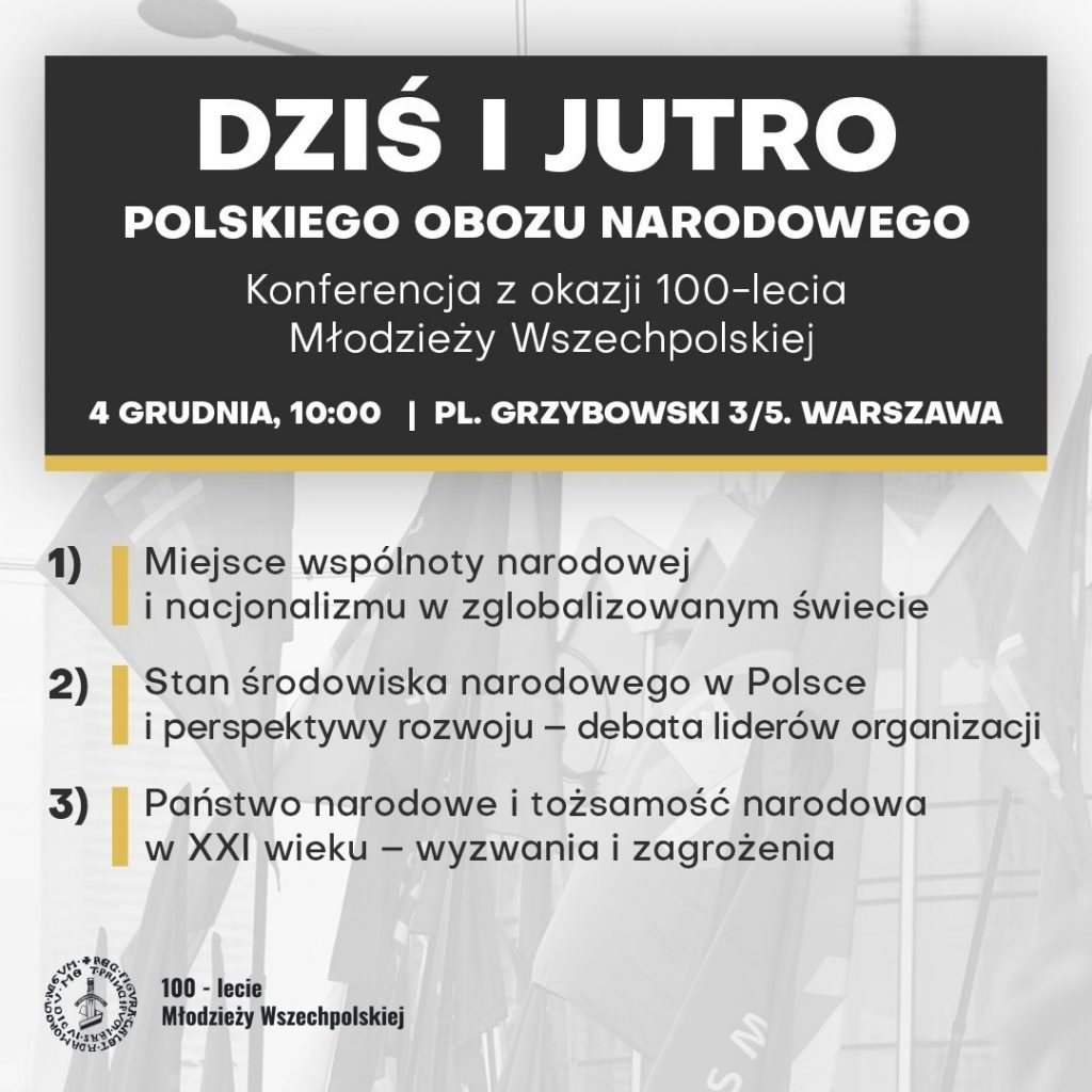 Młodzież Wszechpolska zaprasza na konferencję „Dziś i jutro polskiego obozu narodowego”, która odbędzie się w Warszawie 4 grudnia 2021. Wydarzenie także okazją do zastanowienia się nad miejscem nacjonalizmu we współczesnej rzeczywistości i możliwościach twórczego rozwoju tradycji intelektualnych pozostawionych w spadku przez poprzednie pokolenia narodowców.