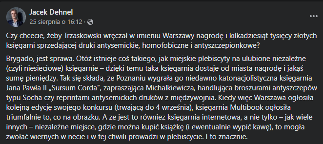 Wraz z Wyborczą larum podniósł m.in. homoseksualny pisarz Jacek Dehnel, który wzywał do głosowania przeciwko księgarni, podobnie jak wspomniana przed chwilą gazeta. Wspomniał również, że to nie pierwszy taki wynik w Polsce. Jakiś czas temu analogiczny konkurs wygrała, zdaniem pisarza, „katonacjonalistyczna” Księgarnia im. Jana Pawła II „Sursum Corda”. Mimo tylu nieprzychylnych głosów, 9 września okazało się, iż Multibook zajął w plebiscycie pierwsze miejsce z 4881 głosami, co przełożyło się na 35,85% wszystkich głosów.
