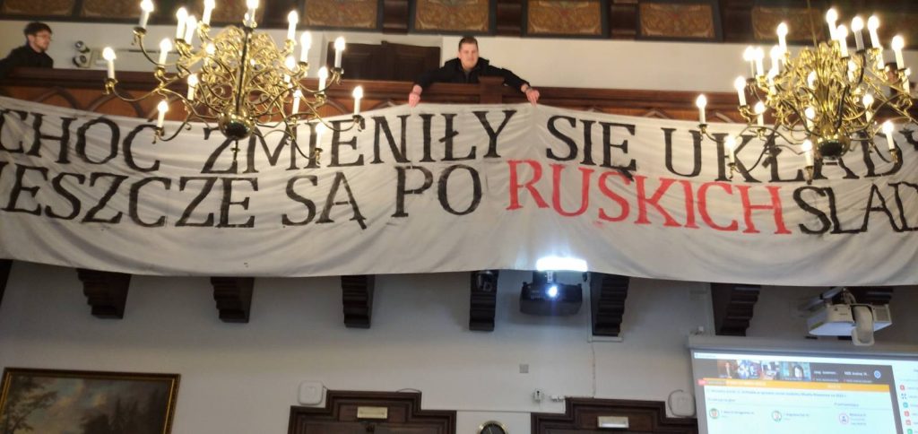 Baner został też wywieszony na balkonie w ratuszu, gdzie odbywała się sesja Rady, przypominał w ten sposób obradującym, czyjej propagandzie służą komunistyczne pomniki.