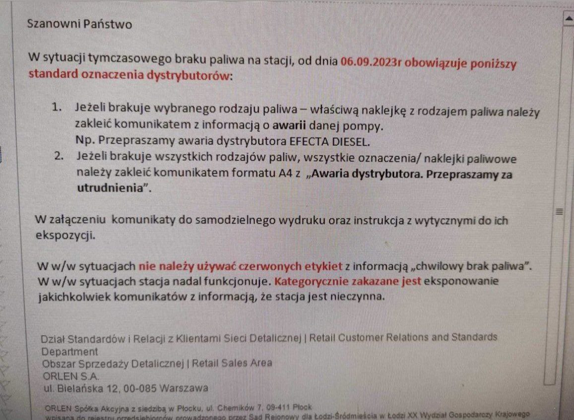 Do internetu wyciekł który miał trafić do stacji Orlenu. Firma nakazywała wywieszanie informacji o awariach, gdy były problemy z dostępnością paliw.